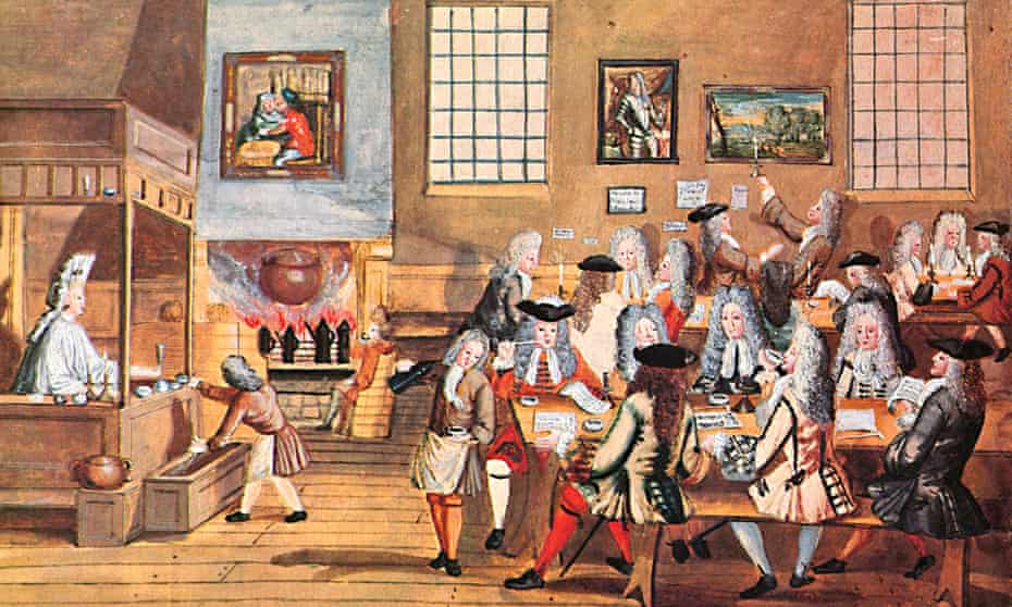 London’s coffeehouses were distinguished one from another by the professional or intellectual interests of their patrons, which eventually gave them specific institutional identities. So, for example, merchants and men with interests in shipping gathered at Lloyd’s Coffee House. Here you could learn what ships were arriving and departing, and buy an insurance policy on your cargo. Lloyd’s Coffee House eventually became the insurance brokerage Lloyd’s of London. Learned types and scientists – known then as “natural philosophers” – gathered at the Grecian, which became closely associated with the Royal Society; Isaac Newton and Edmond Halley debated physics and mathematics here, and supposedly once dissected a dolphin on the premises.