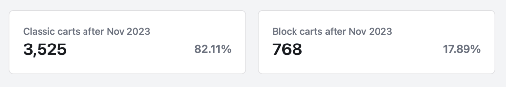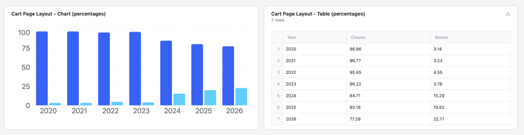 This isn’t a totally fair comparison, though. The cart & checkout blocks only officially rolled out in late 2023, and older sites are less likely to update (I bet store owners don’t like to touch a working system).
