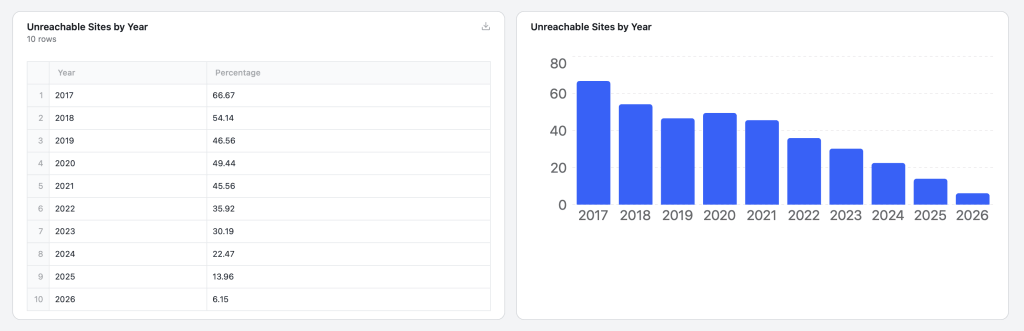 We included sites in maintenance mode as “unreachable,” because many appear to have been in that state for a long time. It’s likely these sites are no longer active, with maintenance mode being an easy way to take a site offline without losing the work. 167 sites fell into this category, so the ambiguity is minimal.