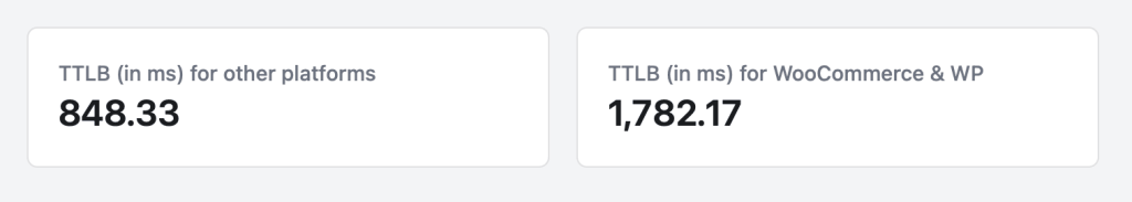 Sites using WooCommerce have an average TTLB of 1,782 ms, compared to 848ms for sites not using WooCommerce or WP.